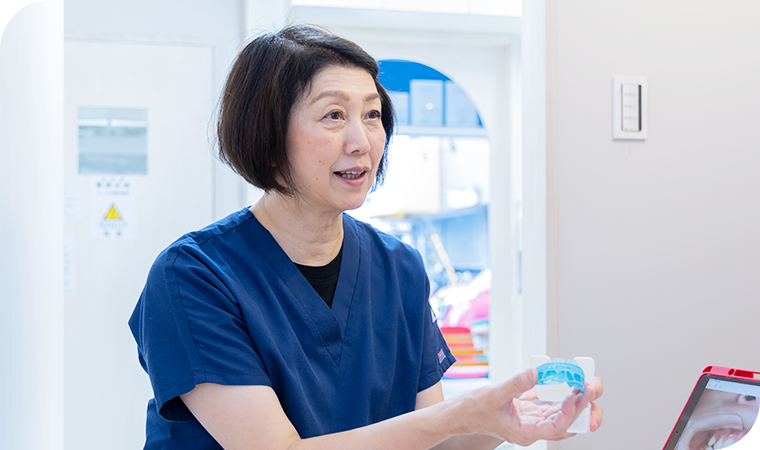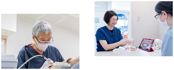 「どのような治療か不安だ」「自分ではお口の中のことがわからない」など、治療に対する不安や心配を抱える患者さんも少なくありません。そこで当院は分かりやすい説明以外にも、ご相談やお悩みごとへの丁寧な回答を心がけております。一人ひとりの患者さんに寄り添い、お口の健康をサポートいたします。