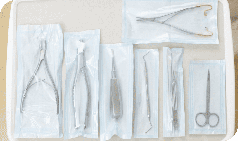 スタッフや患者さまの手指消毒だけでなく、手すりやイスなど不特定多数の方が触れる箇所も定期的に除菌を行っております。またすべての医療器具は滅菌処理を行い、滅菌パックにて保管しています。